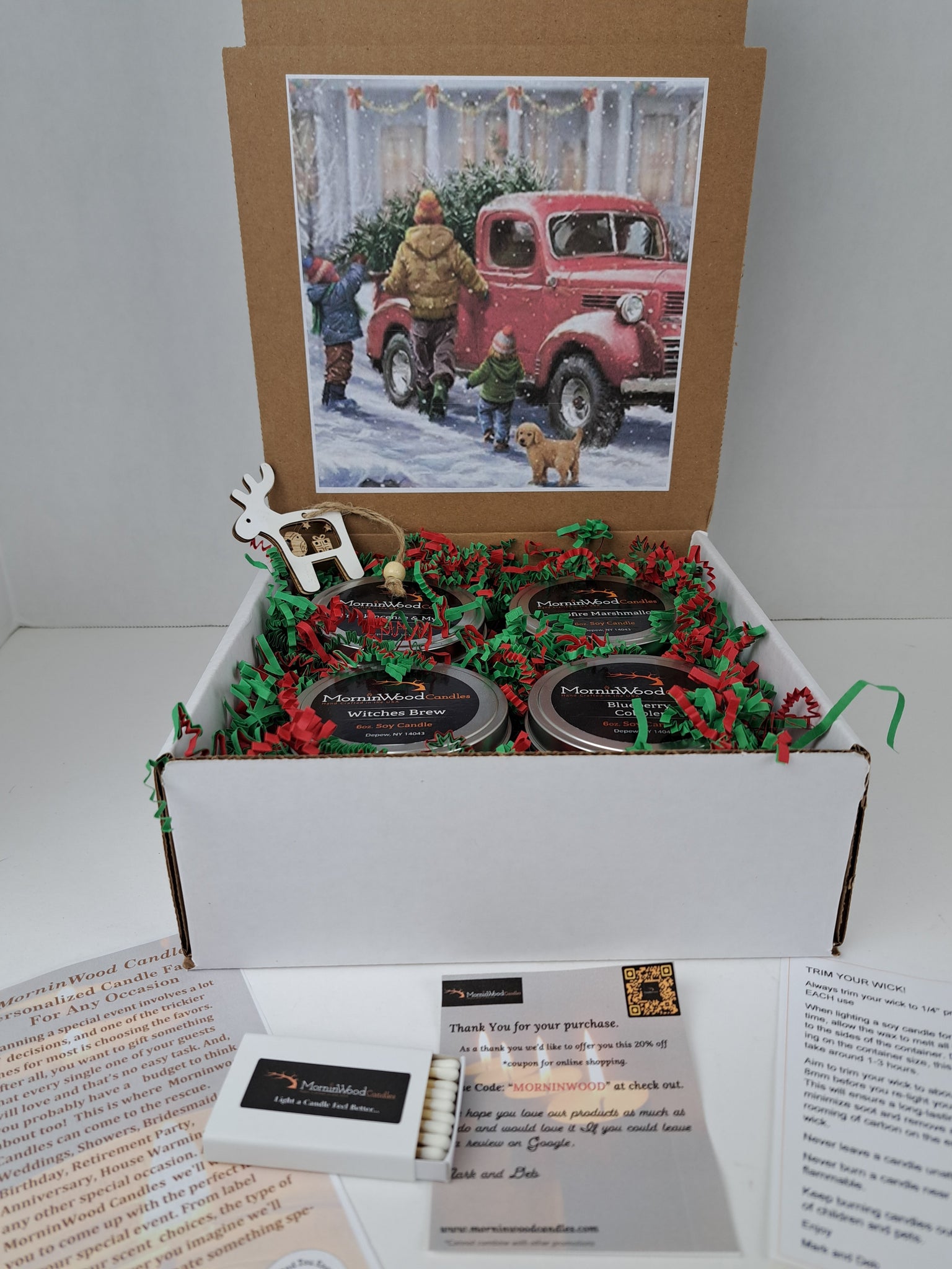 Each box comes with 4 of our hand made small batch candles,*Tree Ornament, a 20% off Coupon, and a Holiday Message, Nestled in festive holiday shred and topped off with a box of wooden matches.
