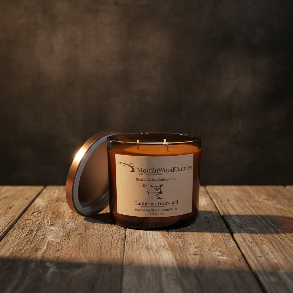 Our Caribbean Teakwood scented Candle is a bold, complex fragrance with wide appeal. It leads with spicy top notes of allspice blended with rich leather. Notes of tobacco leaf and clove blend into the woody, deep base of sandalwood, amber, and peppercorn.