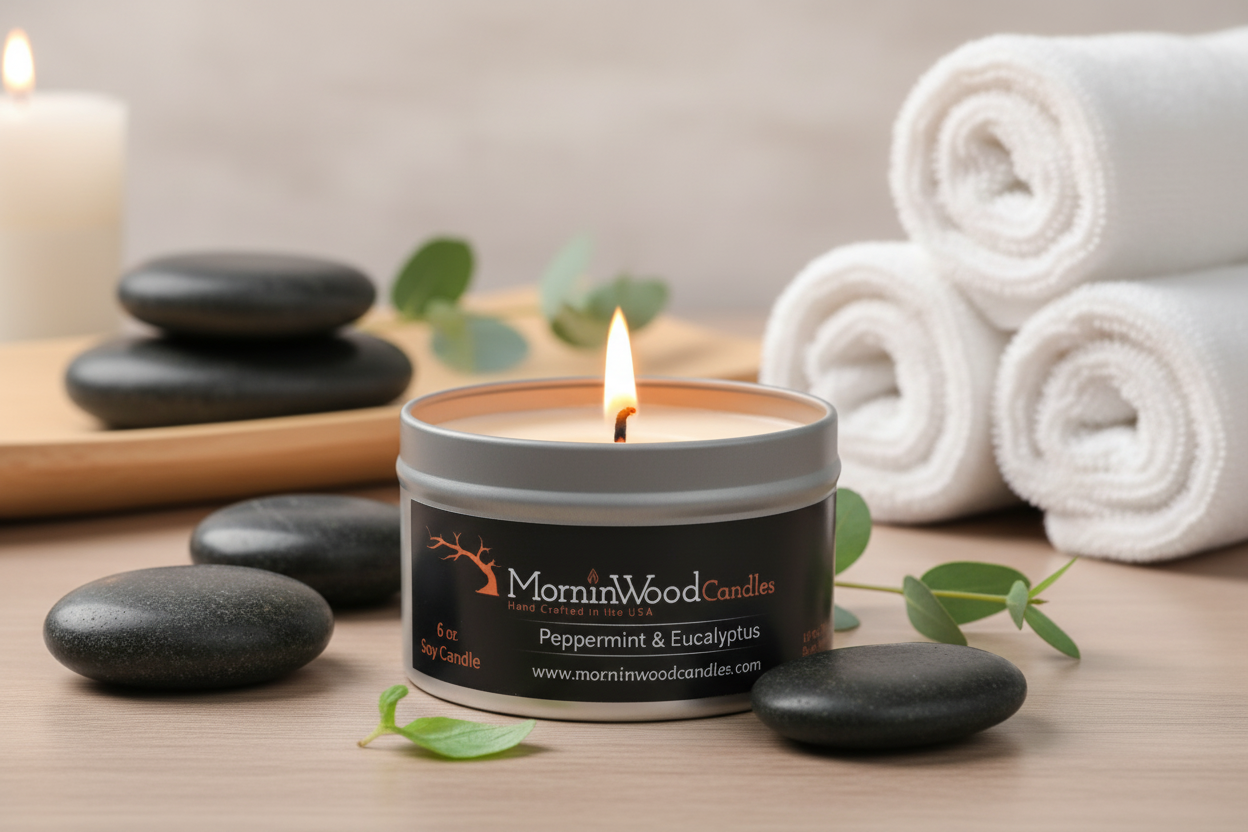 100% Soy Infused with natural essential oils, including eucalyptus oil, corn mint oil, cedarwood oil, and patchouli oil.